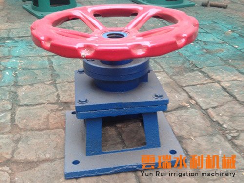 2、将手动螺杆启闭机置于安装位置。把一个限位盘套在螺杆上,将螺杆从横梁的下部旋入机器中,当螺杆从机器的上方露出后,再套上限位盘。螺杆的下方与闸门连接。