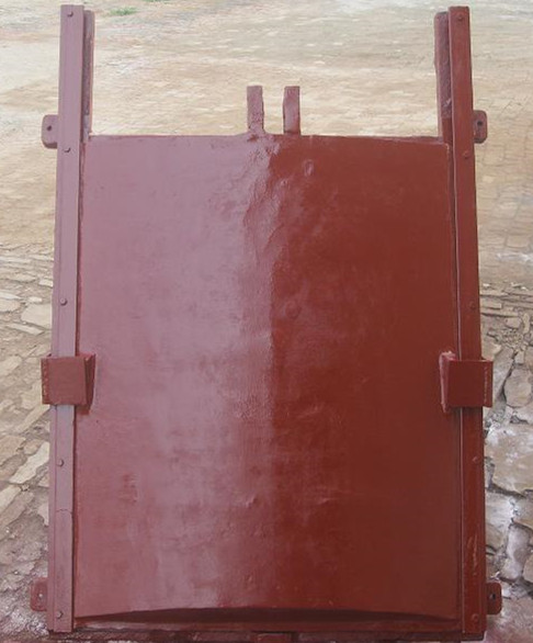 门体一般采用面板与加强肋的结构,面板可做平面或拱形。门体一般整体铸造和机加工,但尺寸较大的可采用分块组成式。门体上一般采用整体式金属止水,兼作支承滑块,金属止水用同材料制作的沉头螺钉紧固在门体上,螺钉头部与止水工作面一起精加工,一些尺寸较大的也可"P"形橡皮止水。