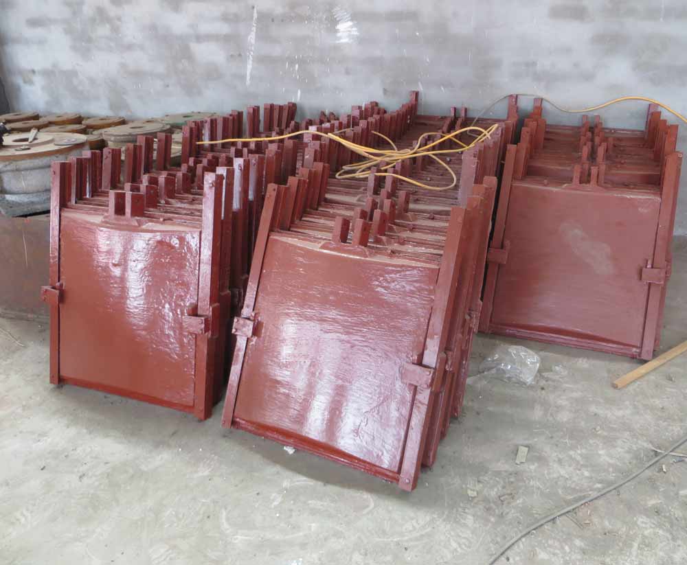 门体一般采用面板与加强肋的结构,面板可做平面或拱形。门体一般整体铸造和机加工,但尺寸较大的可采用分块组成式。门体上一般采用整体式金属止水,兼作支承滑块,金属止水用同材料制作的沉头螺钉紧固在门体上,螺钉头部与止水工作面一起精加工,一些尺寸较大的也可“P”形橡皮止水。