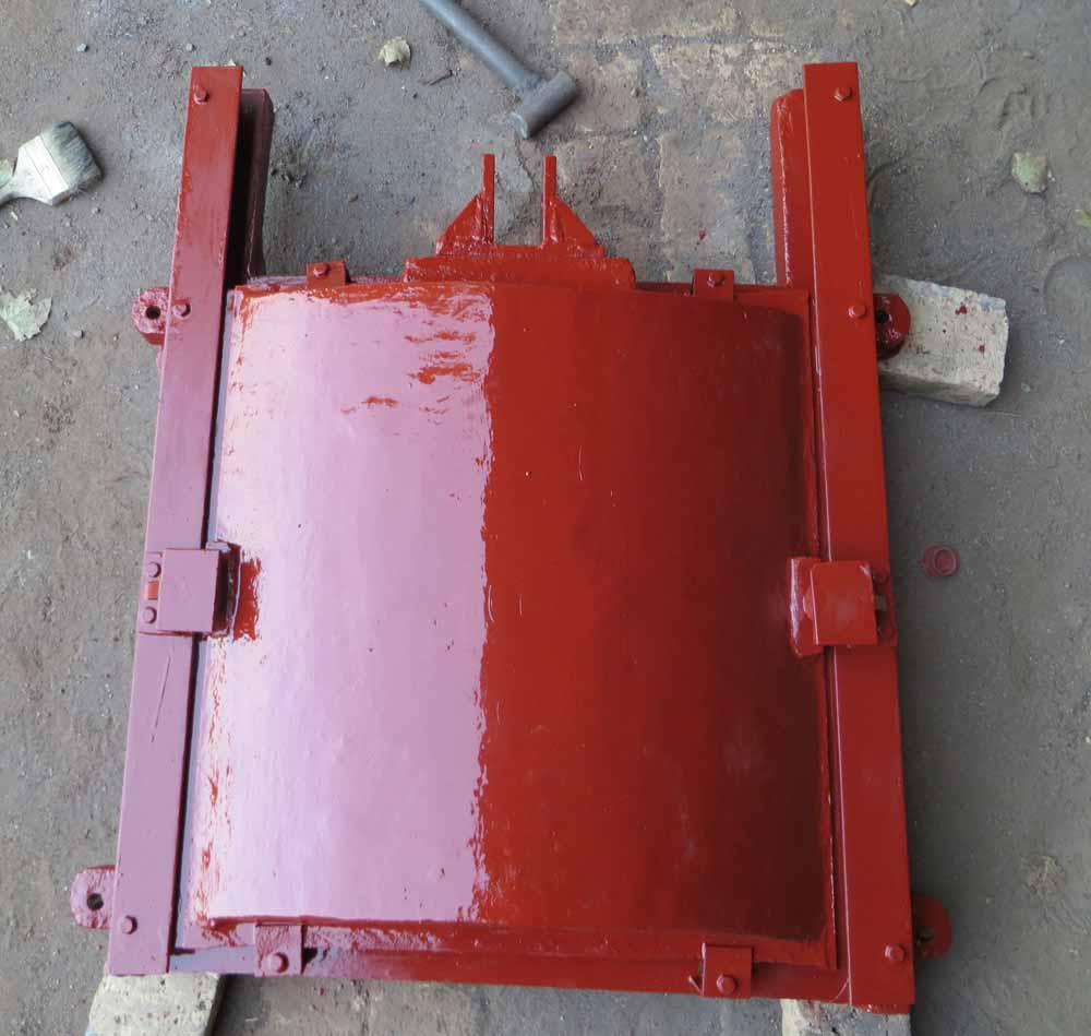 门体一般采用面板与加强肋的结构,面板可做平面或拱形。门体一般整体铸造和机加工,但尺寸较大的可采用分块组成式。门体上一般采用整体式金属止水,兼作支承滑块,金属止水用同材料制作的沉头螺钉紧固在门体上,螺钉头部与止水工作面一起精加工,一些尺寸较大的也可“P”形橡皮止水。