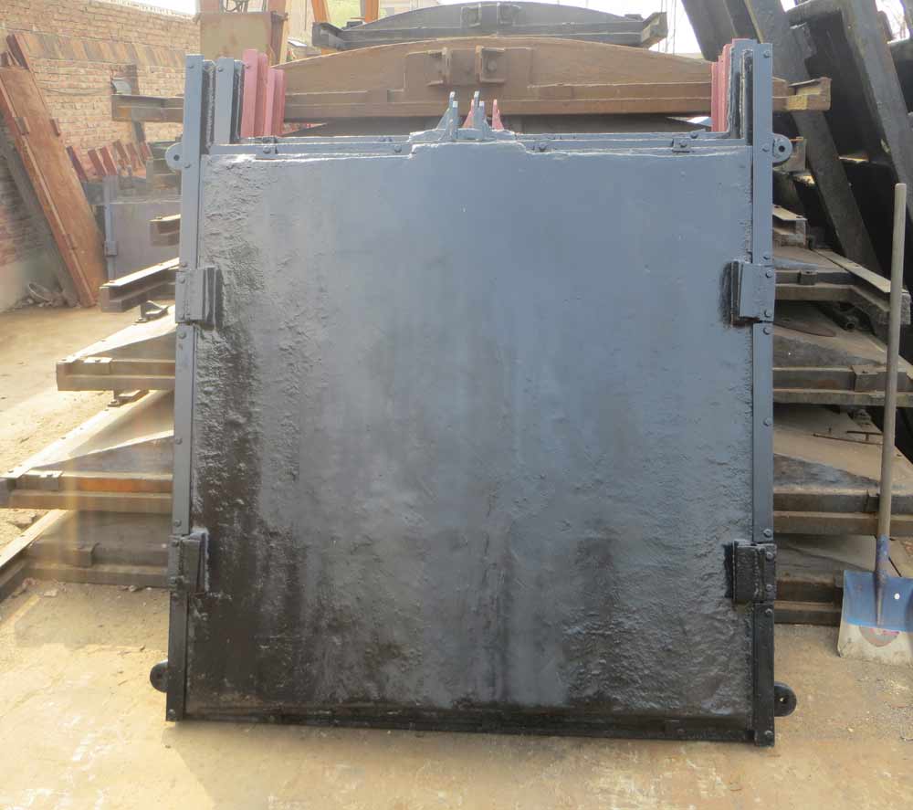 门体一般采用面板与加强肋的结构,面板可做平面或拱形。门体一般整体铸造和机加工,但尺寸较大的可采用分块组成式。门体上一般采用整体式金属止水,兼作支承滑块,金属止水用同材料制作的沉头螺钉紧固在门体上,螺钉头部与止水工作面一起精加工,一些尺寸较大的也可“P”形橡皮止水。
